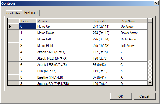 The Controls dialog allows you to view the control mappings for controllers and the keyboard. Where available, button equivalents for Saturn, Playstation, and Xbox controllers are shown.