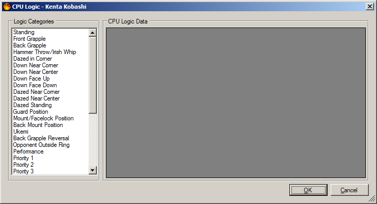 Right clicking the Skills, Parameters, Moveset, and CPU Logic buttons displays a context menu, which can be used to copy and paste these items to other edit wrestlers.