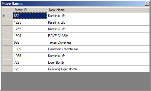 Fire Pro Wrestling World allows you to globally rename moves. This is useful if you find that the new default move names aren't memorable enough. However, these values are best set in the game itself, so this section is read-only.