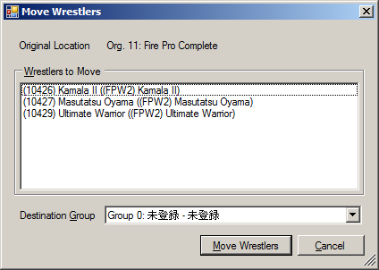 The Move Wrestlers dialog appears once you've selected wrestlers to move. Their current location is noted at the top. The wrestlers to be moved are in the middle; they can't be changed at this point (this could change in future versions). The bottom of the dialog contains the Destination Group option, which is where the wrestlers will be moved to. Pressing the "Move Wrestlers" button will perform the move.