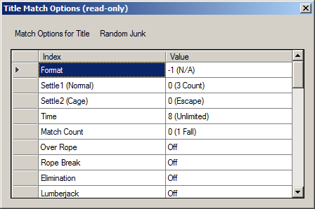 Clicking the "View Match Options..." button brings up the Title Match Options dialog. The data in this dialog is read-only. Most values are decoded at this point, though the Arena is an exception.