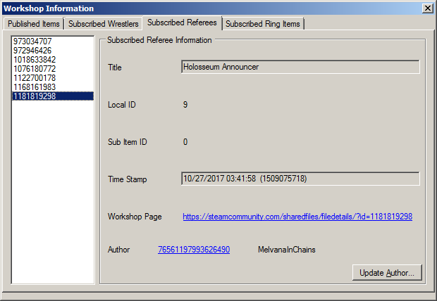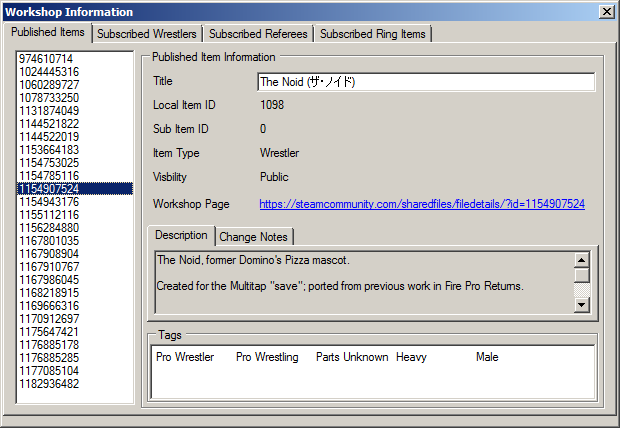 The Workshop portion of the program handles the Steam Workshop information contained in the save file. Workshop information is separated into four categories: Published Items, Subscribed Wrestlers, Subscribed Referees, and Subscribed Ring Items.