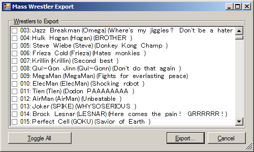 Each of the wrestlers is displayed in a checkbox list; clicking on the name is enough to toggle the checkmark. There is also a "Toggle All" button, in case you don't want to click on every single wrestler you want to import.